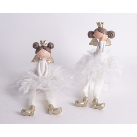 Polcon ülő angyalfigurák bolyhos tollszoknyával, arany csizmával és lógó lábakkal. 2 választható figura. Varázslatos polcon ülő angyalfigurák bolyhos tollszoknyával, arany csizmával és lógó lábakkal. A választékban korona és szív minták találhatók. Mér