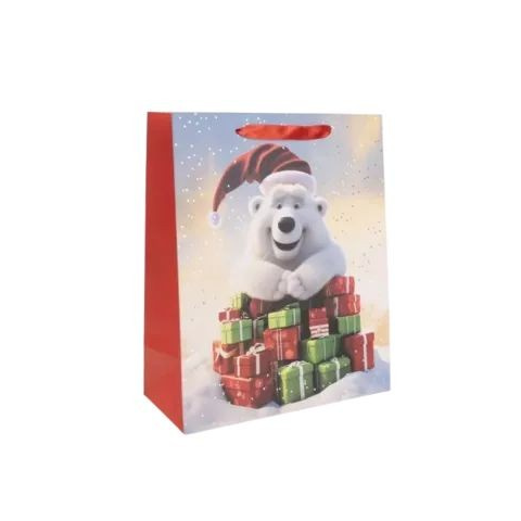 Jegesmacit ábrázoló ajándékzacskó szalagfüllel, hogy az ünnep még boldogabb legyen. Praktikus, többször felhasználható, ezért kevésbé károsítja a környezetet, mint a hagyományos csomagolópapír.Anyaga: Papír/műanyagA termék mérete: 18 x 23 cm