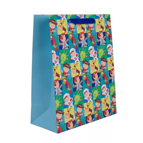 Kisfiúkat ábrázoló ajándékzacskó szalagfüllel, hogy az ünnep még boldogabb legyen. Praktikus, többször felhasználható, ezért kevésbé károsítja a környezetet, mint a hagyományos csomagolópapír.Anyaga: Papír/műanyagA termék mérete: 18 x 23 cm