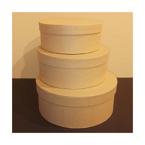 Natúr színű 3 darabból álló kör alakú karton doboz szett. Festhető, stencillel , rizspapírokkal díszithető. A legnagyobb doboz átmérője 20 cm, magassága 8 cm. A középső doboz átmérője 17 cm, magassága 7 cm. A legkisebb doboz átmérője 15 cm, magassága 6 cm. Belső műanyag bélésének köszönhetően alkalmas rózsadoboz készítéséhez is.