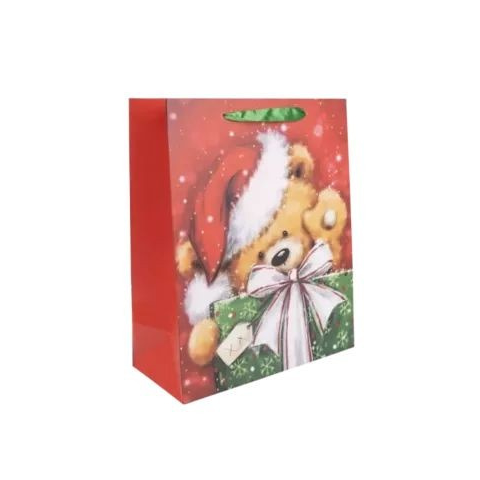 Mikulássapkás macit ábrázoló ajándékzacskó szalagfüllel, hogy az ünnep még boldogabb legyen. Praktikus, többször felhasználható, ezért kevésbé károsítja a környezetet, mint a hagyományos csomagolópapír.Anyaga: Papír/műanyagA termék mérete: 18 x 23 cm