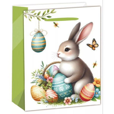 Szürke nyuszi mintás ajándékzacskó szalagfüllel, hogy az ünnep még boldogabb, vidámabb és édesebb legyen az ünnep. Praktikus, többször felhasználható, ezért kevésbé károsítja a környezetet, mint a hagyományos csomagolópapír.Anyaga: Papír/műanyagA termék mérete: 18 x 23 cm