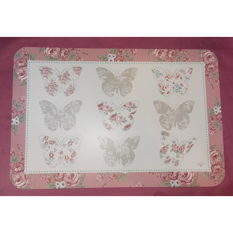Pillangó-és virágmintás műanyag reggeliző alátét, mérete: 45x30 cm. Tisztítása: nedves ruhával.