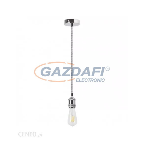 Indusztriális stílusú függeszték 1 db foglalattal. 80 cm lelógású, ezüst színű fém szerkezet és foglalat, szövött ’vasalókábel’ vezetékkel. A függeszték E-27-es foglalatú, max. 40W teljesítményű energiatakarékos fényforrással, így akár a különleges megjel