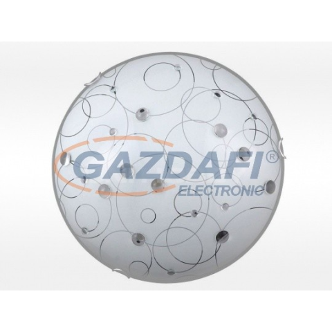 30 cm átmérőjű, modern megjelenésű mennyezeti lámpa, fém és műanyag szerkezettel, kiváló minőségű, 3D hatású, üveggyöngyözött, fehér alapszínű, mintás lámpabúrával. E27-es foglalatú, maximum 60W teljesítményű, halogén vagy LED fényforrással is használható