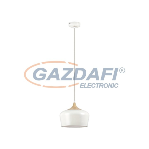 Skandináv stílusú függeszték 1 db foglalattal. 130 cm lelógású, fehér színű fém szerkezet továbbá fehér és bükk színkombinációjú, 30 cm átmérőjű fém lámpabúra. A függeszték E-27-es foglalatú, max. 60W teljesítményű energiatakarékos fényforrással is haszná