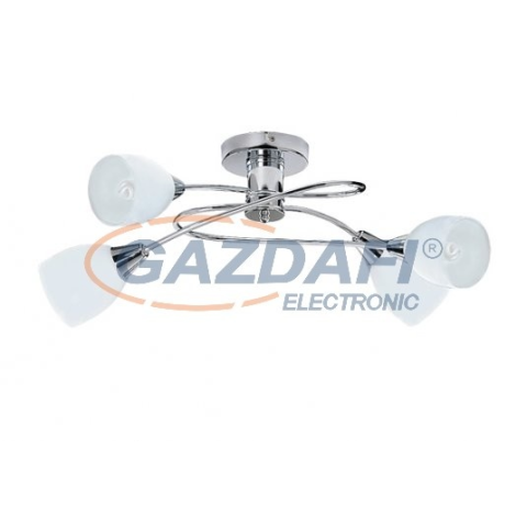 Modern megjelenésű mennyezeti lámpa 4 db foglalattal. 55 cm átmérőjű, króm színű fém test és fehér színű üveg lámpabúrák. A lámpatest E14-es foglalatkialakítású, max. 4x 60W teljesítményű energiatakarékos fényforrásokkal is használható.RÁBALUX 2598 általá