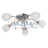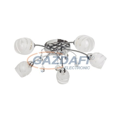 Időtlen megjelenésű mennyezeti lámpa 5 db foglalattal. 60 cm átmérőjű, króm színű fémből készített lámpatest mintás üveg lámpabúrákkal és díszítőelemekkel. A lámpatest E14-es fogalatkialakítású, max. 5x 60W teljesítményű fényforrásokkal használható.RÁBALU