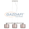 Időtlen megjelenésű függeszték 3 db foglalattal. 100 cm lelógású, 80 cm széles, króm színű fém lámpatest valamint barna és fehér színkombinációjú textil lámpabúra. A függeszték E-27-es foglalatú, max. 3x 60W teljesítményű energiatakarékos fényforrásokkal