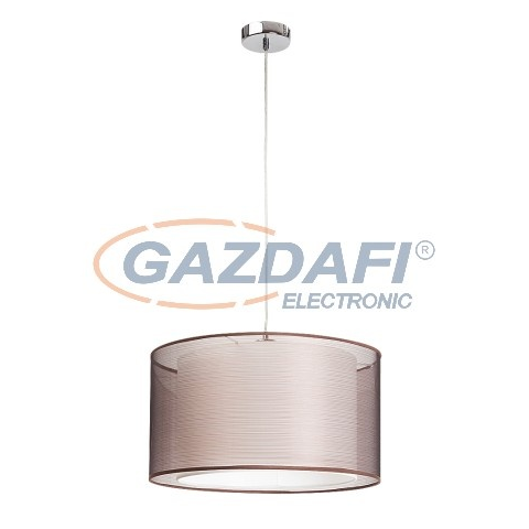 Időtlen megjelenésű függeszték 1 db foglalattal. 108 cm lelógású, króm színű fém lámpatest és barna és fehér színkombinációjú, 44,5 cm átmérőjű textil lámpabúra. A függeszték E-27-es foglalatú, max. 60W teljesítményű energiatakarékos fényforrással is hasz