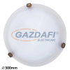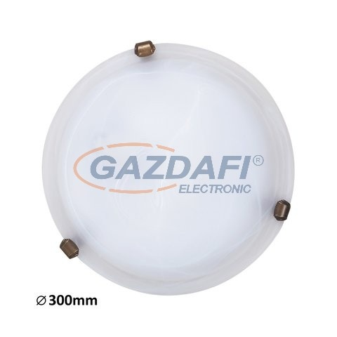 30 cm átmérőjű, hagyományos stílusú mennyezeti lámpa, fém és műanyag szerkezettel, kiváló minőségű, vastag, fehér alabástromüveg lámpabúrával, bronz színű rögzítő körmökkel. E27-es foglalatú, maximum 60W teljesítményű, halogén vagy LED fényforrással is ha