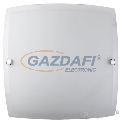Modern megjelenésű mennyezeti lámpa 2 db foglalattal. 40 cm széles, fémből készített test fehér opálüveg lámpabúrával és króm színű rögzítő csavarokkal. A lámpatest E27-es foglalatkialakítású, max. 2x 60W teljesítményű hagyományos és energiatakarékos fény