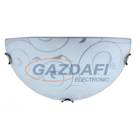 30 cm átmérőjű,időtlen megjelenésű fali lámpa. Fém szerkezetű, fehér domobrú opálüvegbúra indás mintával, króm színű rögzítőkörmökkel. E27-es foglalatú, maximum 60W teljesítményű, halogén vagy LED fényforrással is használható.RÁBALUX 3851 általános leírás