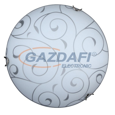 30 cm átmérőjű, időtlen megjelenésű mennyezeti lámpa. Fém szerkezetű, fehér domobrú opálüvegbúra indás mintával, króm színű rögzítőkörmökkel. E27-es foglalatú, maximum 60W teljesítményű, halogén vagy LED fényforrással is használható.RÁBALUX 3852 általános