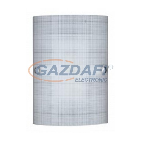 26 cm magas és 18 cm széles, időtlen stílusú fali lámpa. Fém szerkezet, vonalas mintájú, fehér domború kialakítású opálüveg lámpabúrával és króm színű díszcsavarokkal. E27-es foglalatú, maximum 60W teljesítményű, halogén vagy LED fényforrással is használh