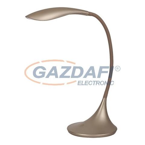 Modern megjelenésű asztali lámpa beépített energiatakarékos LED fényforrással és 3 fokozatban állítható, érintőkapcsolós fényerősségszabályozóval. 52 cm magas, 32 cm széles, pezsgő színű műanyag lámpatest és műanyag lámpabúra. A beépített LED-es lámpa A++