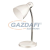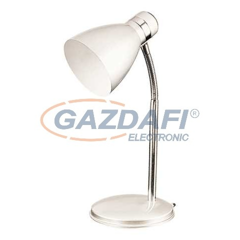 Praktikus íróasztali megvilágítást biztosító asztali lámpa. 32 cm magas, fémből készített, fehér és króm színű lámpatest, fehér színű, pozícionálható lámpabúrával, hálózati vezetékkel és kapcsolóval. A lámpatest max. 40W teljesítményű, E14-es foglalatú, h