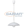 Időtlen megjelenésű függeszték 1 db foglalattal. Állítható, de maximum 120 cm lelógású, 40 cm átmérőjű, fehér színű műanyagból készített függeszték és üveg lámpabúra, IP20-as védelemmel. A lámpatest E27-es foglalatkialakítású, max. 60W teljesítményű energ
