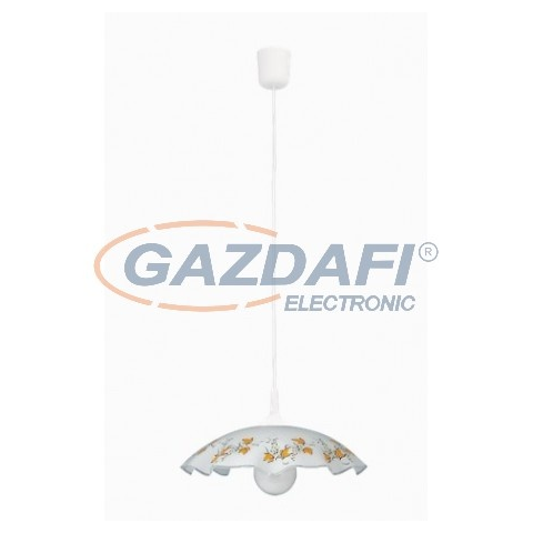 Időtlen megjelenésű függeszték fix kivitelű, 90 cm-es, fehér színű műanyag függesztékkel és 40 cm-es ármérőjű, íves és hullámos kialakítású, fehér és áttetsző mintás üvegbúrával. Az IP20-as védettséget kínáló lámpatest E27-es foglalatú, max. 60W teljesítm