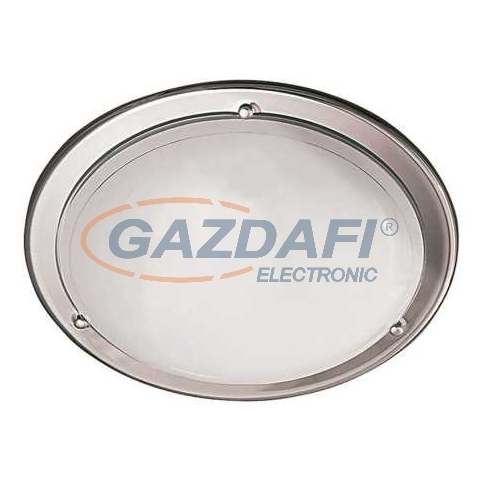 Időtlen megjelenésű, fém és üveg kombinációjú mennyezeti lámpa, 2 darab E27-es foglalattal. 38 cm átmérőjű, króm színű fém lámpatest, fehér színű opálüvegbúrával. A lámpatest E27-es, max. 2x 60W teljesítményű energiatakarékos fényforrásokkal is használhat