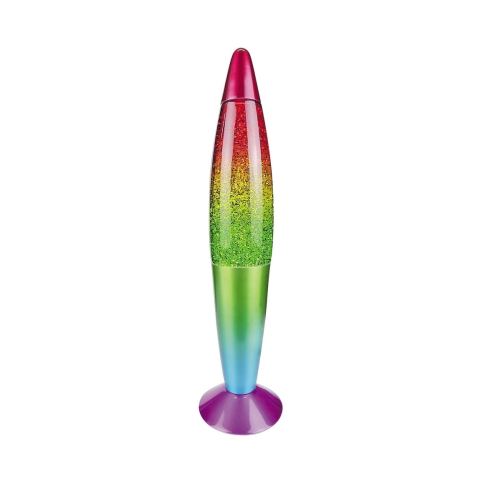 A Glitter Rábalux 7008 lávalámpa 34 cm-es magasságával és színes, glitteres kivitelével dekoratív hangulatvilágítást biztosít bármely helyiségben. A lámpatest egy E14 foglalattal rendelkezik, amelybe cserélhető fényforrás helyezhető, és a termék tartalmaz