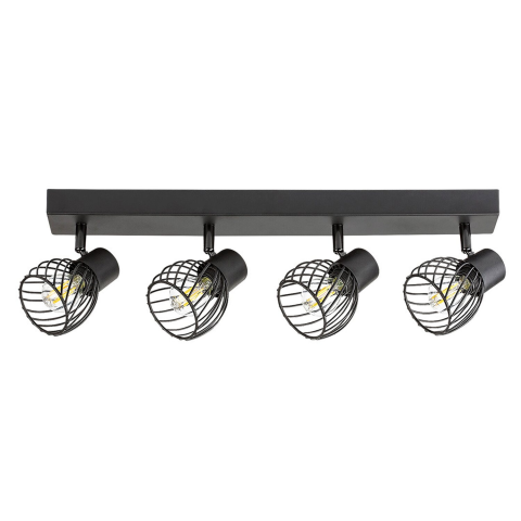 Az indusztriális stílusú Aberama négyes mennyezeti spotlámpát elsősorban a nappaliba vagy a hálószobába ajánljuk. A fekete színben, teljes egészében műanyagból készült modellt gömb alakú, alul nyitott rácsos búrák egészítik ki és téglalap alakú dísztalp segítségével rögzíthető a mennyezetre. A sorban, egymás mellett elhelyezkedő, mozgatható lámpafejeknek köszönhetően a lámpa fényét tetszés szerint irányíthatjuk. Az Aberama négy darab, egyenként l