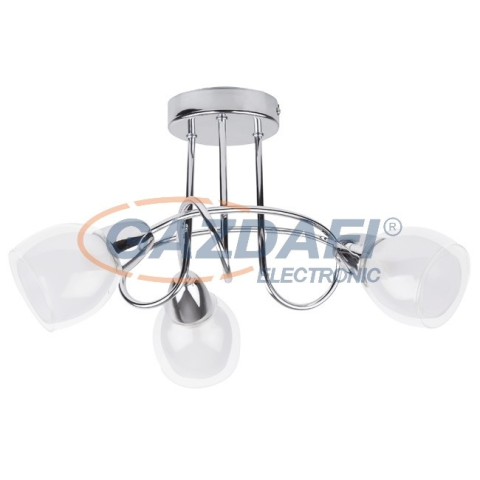 Modern megjelenésű mennyezeti lámpa 3 db foglalattal. 41 cm átmérőjű, króm színű fém lámpatest és fehér és áttetsző színkombinációjú üveg lámpabúrák. A lámpatest E-14-es foglalatú, max. 3x 40W teljesítményű energiatakarékos fényforrásokkal is használható.