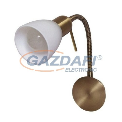 Időtlen stílusú fali spotlámpa 1 db foglalattal, hálózati vezetékkel, kapcsolóval és dugvillával. 20,5 cm magas, bronz színű fém szerkezet és gégecsővel pozícionálható lámpatest, fehér színű üveg búrával, IP20-as védelemmel. A lámpatest E-14-es foglalatú,