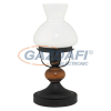 Rusztikus megjelenésű éjjeli lámpa 1 darab foglalattal. 35 cm magas, 17 cm átmérőjű, matt fekete színű fémből és dió színű fabetéttel készített lámpatest, fehér színű opálüveg lámpabúrával. A lámpatest E27-es foglalatú, max. 60W teljesítményű kompakt vagy