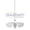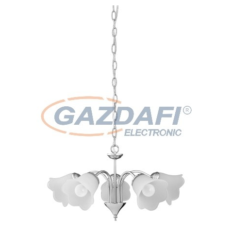 Klasszikus megjelenésű csillár 5 db foglalattal. 90 cm lelógású, 60 cm átmérőjű, króm színű fémből készített lámpatest fehér opálüveg búrákkal. A lámpatest E-14-es foglalatú, max. 5x 40W teljesítményű halogén vagy energiatakarékos fényforrásokkal használh