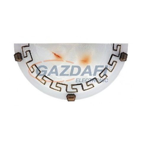 Mediterrán, mégis időtlen stílusú fali lámpa festett búrával. Fém lámpatest 1 darab E27-es foglalattal, festett, görög mintás opálüvegbúrával, bronz színű rögzítőkörmökkel, 30 cm-es átmérővel. A lámpatest E27-es foglalatú, max. 60W teljesítményű halogén,