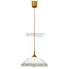 Időtlen megjelenésű függeszték 1 db foglalattal. 90 cm lelógású, 30 cm búraátmérőjű, barna színű lámpatest fehér alapszínű, barna és arany mintás alabástromüveg lámpabúrával. A lámpatest E-27-es foglalatú, max. 60W teljesítményű energiatakarékos fényforrá