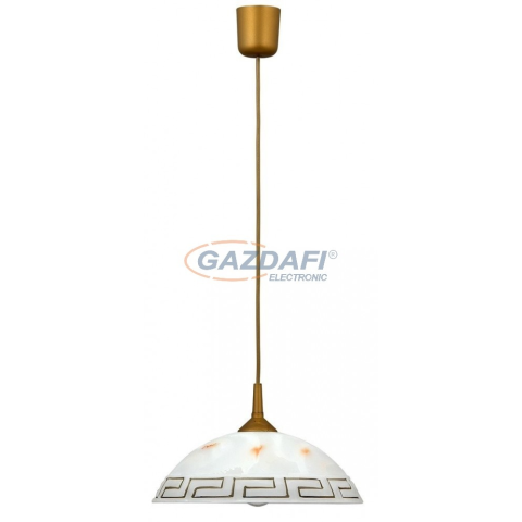 Időtlen megjelenésű függeszték 1 db foglalattal. 90 cm lelógású, 30 cm búraátmérőjű, barna színű lámpatest fehér alapszínű, barna és arany mintás alabástromüveg lámpabúrával. A lámpatest E-27-es foglalatú, max. 60W teljesítményű energiatakarékos fényforrá