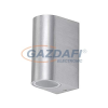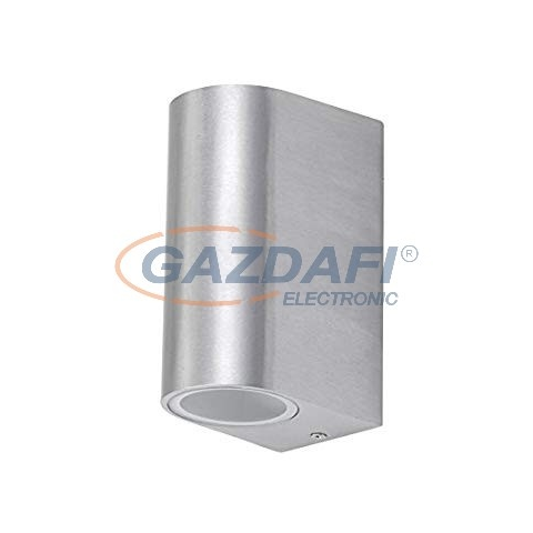 Modern megjelenésű kültéri fali lámpa 2 db foglalattal, le- és felfelé világító kivitelben. 14,5 cm magas, 6,5 cm széles, szálcsiszolt alumínium színű fémből készített lámpatest és üveg lámpabúrák, IP44-es, fröccsenő víz és por elleni védelemmel. A lámpat
