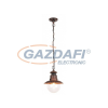 Időtlen megjelenésű kültéri függeszték 1 db foglalattal. 90 cm lelógású, 21,5 cm átmérőjű, antik barna színű, fémből készített lámpatest és áttetsző műanyag lámpabúra, IP44-es, azaz fröccsenő víz és por elleni védelemmel. A lámpatest E27-es foglalatú, max
