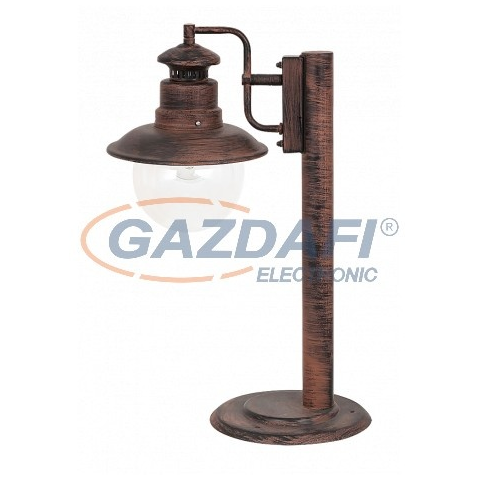 Időtlen megjelenésű kültéri állólámpa 1 db foglalattal. 53,5 cm magas, a lámpatestnél 22 cm átmérőjű, antik barna színű, fémből készített lámpatest és áttetsző műanyag lámpabúra, IP44-es, azaz fröccsenő víz és por elleni védelemmel. A lámpatest E27-es fog