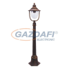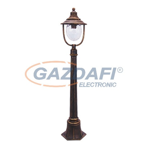 Időtlen megjelenésű kültéri talpas lámpa 1 db foglalattal. 108 cm magas, a lámpatestnél 22,3 cm átmérőjű, antik arany színű, fémből készített lámpatest és üveg lámpabúra, IP43-as védelemmel. A lámpatest E27-es foglalatú, max. 60W teljesítményű fényforráss