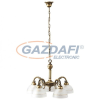 Klasszikus megjelenésű csillár 5 db foglalattal. 90 cm lelógású, 52 cm átmérőjű, bronz színű fémből készített lámpatest diszkrét bronz mintás, fehér opálüveg búrákkal. A lámpatest E27-es foglalatú, max. 5x 40W teljesítményű halogén vagy energiatakarékos f