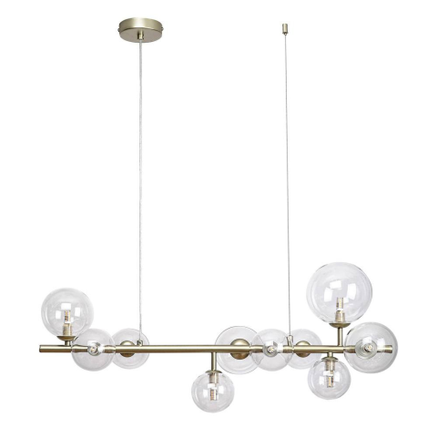 Az Aslov Rábalux 72298 függesztett lámpa arany színű fém és áttetsző üveg anyagok felhasználásával készült, modern megjelenésű világítási megoldás. A lámpatest tíz darab G9 foglalattal rendelkezik, amelyekhez cserélhető fényforrás illeszthető, így a fényá