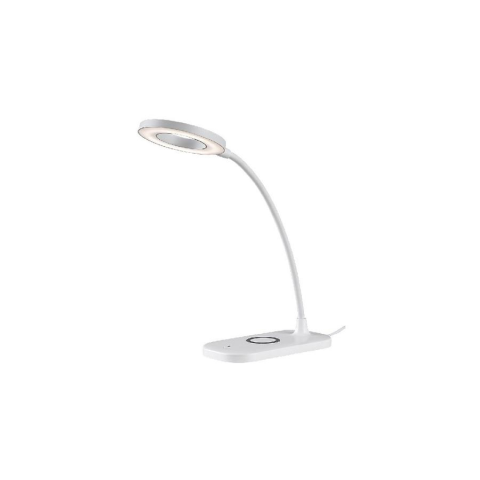 A modern Hardin asztali lámpa számos extra funkciójával nélkülözhetetlen társa lesz a dolgozószobában vagy bármely íróasztalnál. A teljes egészében műanyag okos lámpa fehér színben fehér búrával készül, a lámpafej fánk formájú, a téglalap alakú dísztalp lekerekített sarkakat kapott. A Hardin a G energiaosztályba tartozó beépített LED fényforrással rendelkezik, amelynek a teljesítménye 5 W, fényereje búrával 210 lumen, búra nélkül 720 lumen, élet