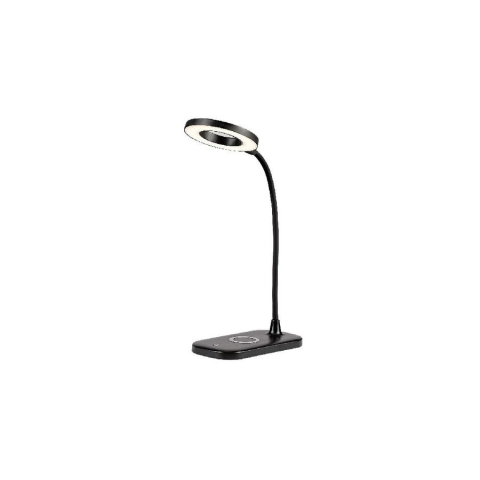A modern Hardin asztali lámpa számos extra funkciójával nélkülözhetetlen társa lesz a dolgozószobában vagy bármely íróasztalnál. A teljes egészében műanyag okos lámpa fekete színben fehér búrával készül, a lámpafej fánk formájú, a téglalap alakú dísztalp lekerekített sarkakat kapott. A Hardin a G energiaosztályba tartozó beépített LED fényforrással rendelkezik, amelynek a teljesítménye 5 W, fényereje búrával 210 lumen, búra nélkül 720 lumen, élet