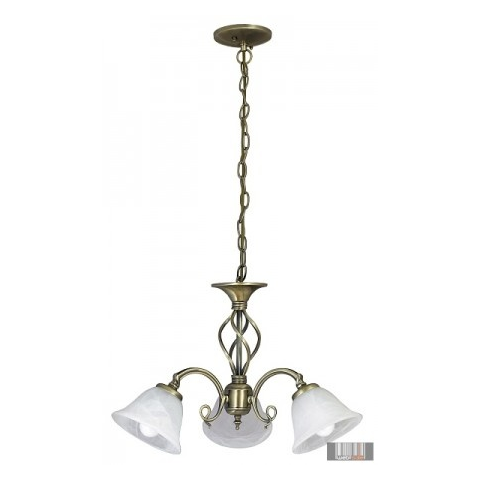 Klasszikus megjelenésű csillár 3 db foglalattal. 100 cm lenyúlású, 60 cm átmérőjű, bronz színű fém lámpatest fehér színű alabástromüveg lámpabúrákkal. A lámpatest E-14-es fogalatkialakítású, max. 3x 40W teljesítményű fényforrásokkal használható.RÁBALUX 71