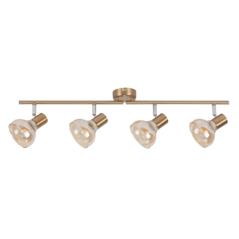 A Holly Rábalux 5550 karos mennyezeti spot lámpa négy E14-es foglalattal rendelkezik, melyekbe cserélhető fényforrás helyezhető. A lámpatest modern stílusú, arany és borostyán színű fém és üveg anyagok kombinációjával készült. A lámpa teljes szélessége 70