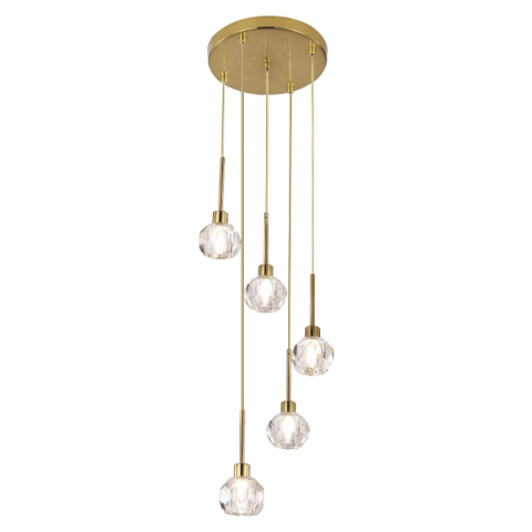 A fém és üveg kombinációjából készült klasszikus stílusú Kassia ötös függeszték nappalink valódi ékessége lehet. Ezt a modern és elegáns modellt azoknak ajánljuk, akik bátran egészítik ki otthonuk berendezését hangsúlyos, egyedi darabokkal. Az eltérő magasságban függő, gömb alakú, kristályszerű búrák igen látványos világítási megoldást kínálnak. Az arany színű, nagyméretű, kerek dísztalppal szerelt Kassia öt darab, egyenként legfeljebb 5 W tej
