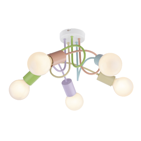 A Linett Rábalux 6340 színes mennyezeti gyereklámpa öt darab E27-es foglalattal rendelkezik, így többféle fényforrás kombinációját teszi lehetővé. A lámpatest masszív fém anyagból készült, amely stabilitást és hosszú élettartamot biztosít. A termék átmérő