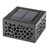 A modern stílusú, szögletes Medulin kültéri napelemes asztali lámpa remek választás lehet a teraszon elköltött kellemes vacsorákhoz és nyáresti beszélgetésekhez. A műanyagból készült, körös-körül szabálytalan mintákkal áttört fekete lámpatestet tejszínű üvegbúra egészíti ki. A Medulin beépített LED fényforrással rendelkezik, amelynek teljesítménye 0,5 W, fényereje búrával 8 lumen, búra nélkül 10 lumen, színhőmérséklete pedig 3000 K. A meleg fehé