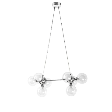 A Briella Rábalux 2624 függesztett lámpa nyolc G9 foglalattal rendelkezik, amelyek mindegyike cserélhető fényforrással szerelhető fel. A modern stílusú lámpatest fém és üveg anyagból készült, ezüst és áttetsző színkombinációban, amely letisztult megjelené