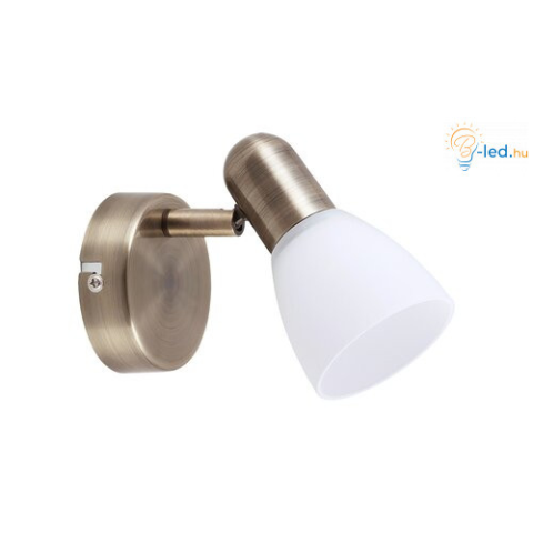 "Időtlen stílusú spotlámpa, 1 darab foglalattal. 11 cm magas, bronz színű fém szerkezet és pozícionálható, fehér színű üvegbúra, IP20-as védelemmel. A lámpatest E14-es foglalatú, max. 40W teljesítményű, halogén vagy energiatakarékos fényforrással is használható. Fényforrás nélkül értékesítjük."