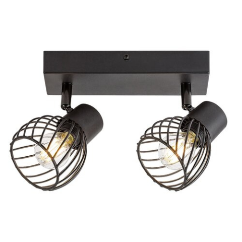 Az indusztriális stílusú Aberama kettes mennyezeti spotlámpát elsősorban a nappaliba vagy a hálószobába ajánljuk. A fekete színben, teljes egészében műanyagból készült modellt gömb alakú, alul nyitott rácsos búrák egészítik ki és téglalap alakú dísztalp s..