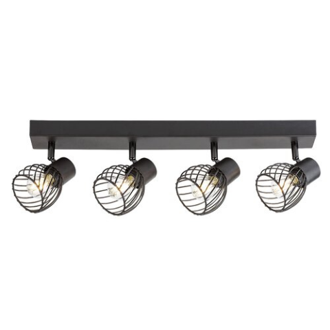 Az indusztriális stílusú Aberama négyes mennyezeti spotlámpát elsősorban a nappaliba vagy a hálószobába ajánljuk. A fekete színben, teljes egészében műanyagból készült modellt gömb alakú, alul nyitott rácsos búrák egészítik ki és téglalap alakú dísztalp s..